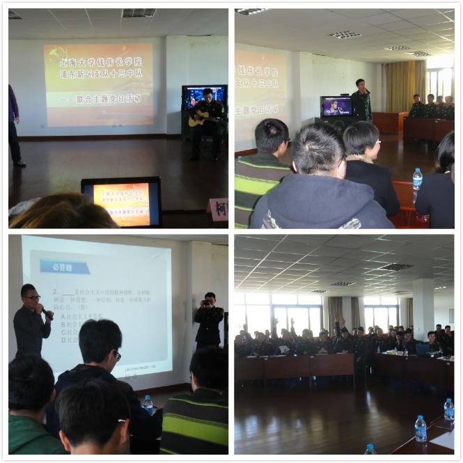 活动开始,武警部队十三中队指导员柯尊军和钱伟长学院直属总支副书记徐晓夏分别肯定了部队与钱伟长学院党支部共建7年来取得的丰硕成果,强调共建活动对提升双方党员理论素养,丰富活动形式所具有的的积极推动意义。曾响应国家号召,在部队服役两年后退伍的钱伟长学院10级学生吴昊阳同学发言,表达了作为退伍军人对部队生活的怀念和作为学生对军人维护和平、艰苦训练具有的尊敬。活动主体内容由社会主义核心价值体系知识竞答构成,答题环节穿插进行学生及士兵表演的节目。经过激烈的必答题、抢答题、风险题三个环节和精彩纷呈的节目,社会主义核心价值体系的理论内容与价值深入人心。此次党日活动在老师同学对部队的参观中结束。