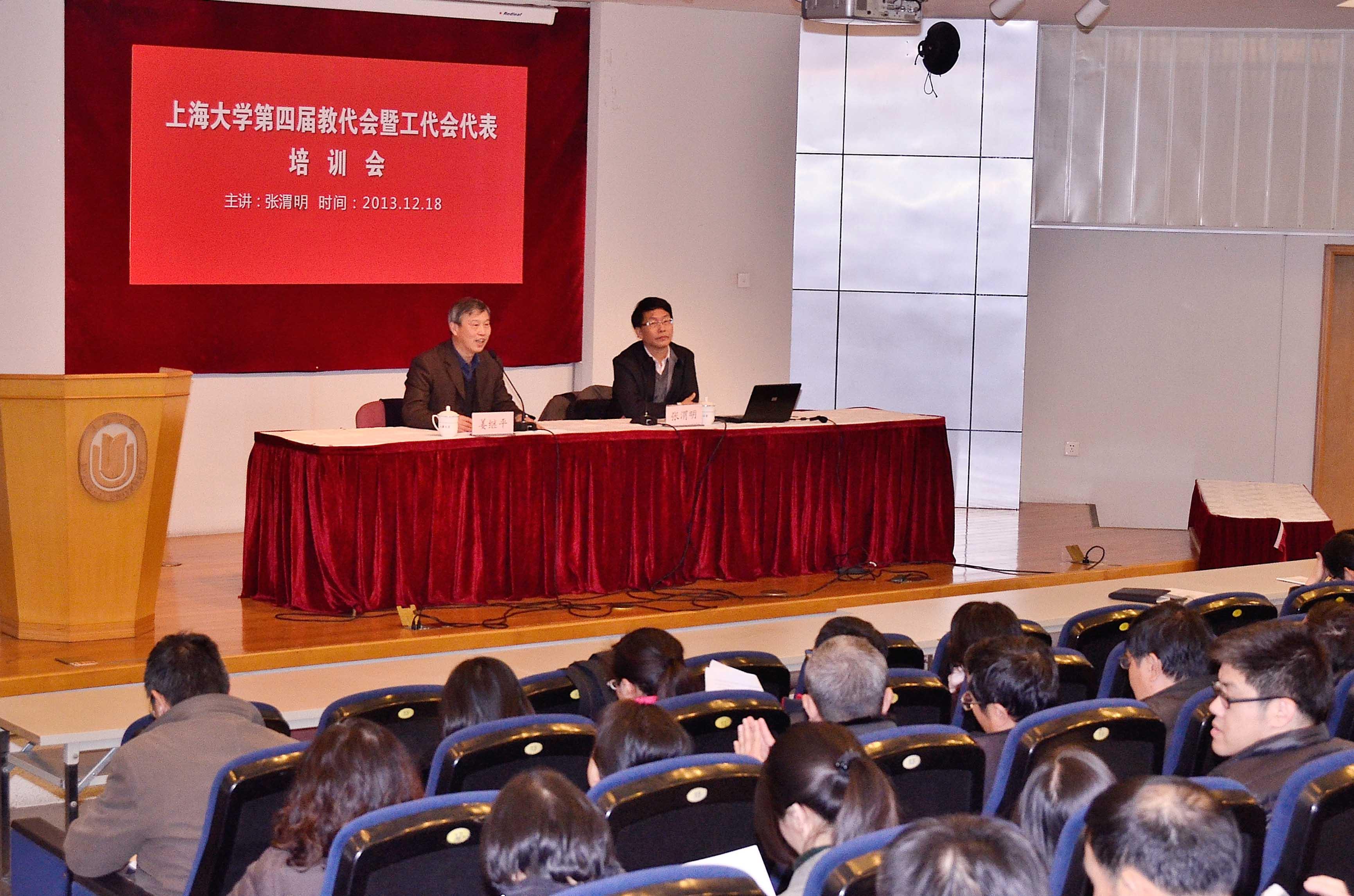 为积极配合上海大学第四届教代会暨工代会(简称“双代会”)第一次会议的顺利召开,有效推进校务公开和民主管理,12月18日下午,校工会特邀市教育工会前基层工作部部长、民主管理专家张渭明,为我校新当选“双代会”代表做了一场专题培训。培训的主题为“教代会代表依法履职、基本知识与基本要求”。校工会副主席姜继平主持了培训会。