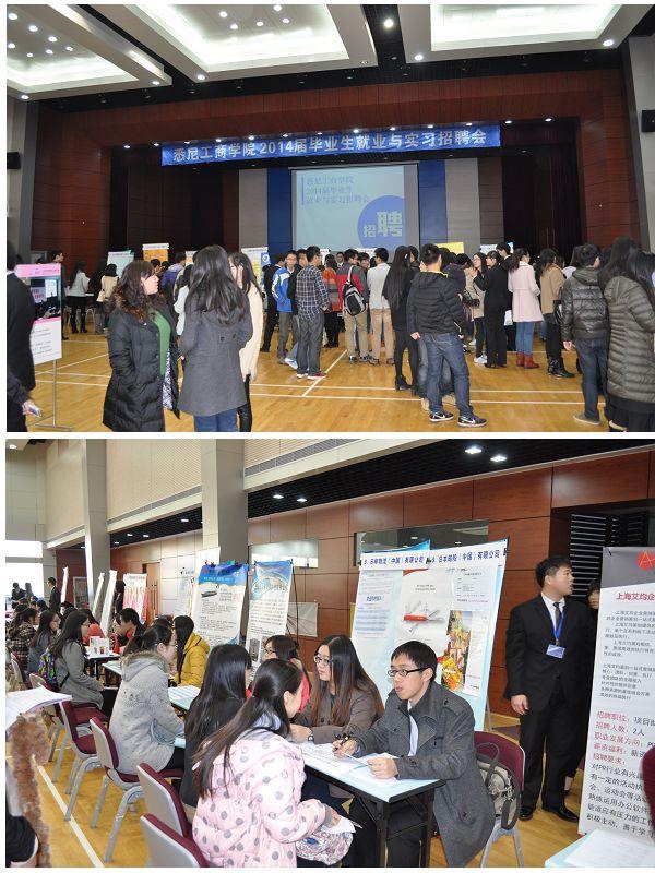 12月10日,悉尼工商学院2014届毕业生专场就业实习招聘会在嘉定校区行健文体中心举行。沃尔沃汽车(中国)、日本邮船(中国)、大微国际集团、大陆汽车投资(上海)、外滩三号饮食文化、美尔雅期货经纪、富士施乐(中国)等三十五家用人单位前来设摊招聘,学院党委书记李双、副院长吕康娟、副书记滕云等亲临现场与用人单位代表和前来应聘的我院学生亲切交流。