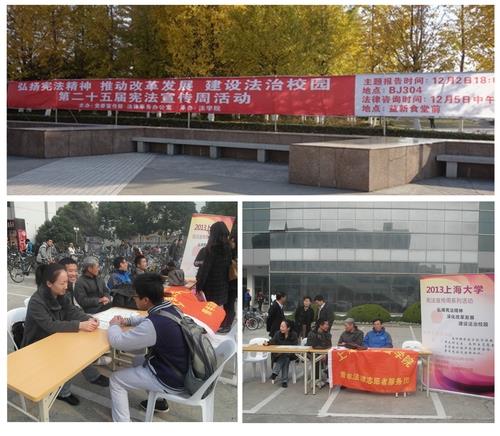今年是“六五”普法中期检查督导之年,也是上海市宪法宣传周确立25周年。为大力宣传党的十八届三中全会精神和以宪法为核心的中国特色社会主义法律体系,深入推进“六五”普法工作和建设法制学校的进程以及进一步提高全体师生的宪法意识和法治观念,以“弘扬宪法精神,推动改革发展,建设法治校园”为主题的2013年度上海大学宪法宣传周活动于12月5日在校本部益新楼前广场成功举办。