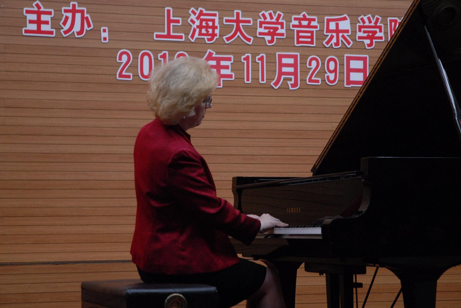11月29日晚19点,经过短暂的休息,刚刚结束为上海大学钢琴协会同学的大师班课程,Sara Davis Buechner女士当晚在图书馆报告厅为上大师生献上了一场精彩的钢琴独奏音乐会。上海大学音乐学院副院长、艺术总监夏小曹、上海大学音乐学院副院长卿扬等亲临音乐会现场。