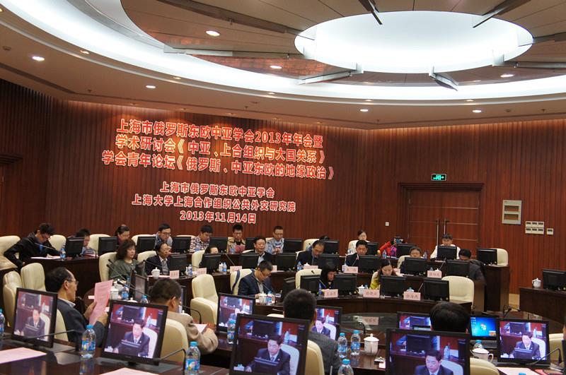2013年11月14日上午,由上海市俄罗斯东欧中亚学会和上海大学上海合作组织公共外交研究院联合主办的上海市俄罗斯东欧中亚学会2013年学术年会暨学术研讨会《中亚、上合组织与大国关系》在上海大学宝山校区国际会议中心举行。上海市俄罗斯东欧中亚学会会长、华东师范大学副校长范军,学会秘书长、同济大学中东欧研究所所长杨烨,上海社会科学院欧亚研究所学术委员会主任余建华,上海大学党委副书记忻平,校长助理、上海合作组织公共外交研究院院长李伟,上海大学国际交流学院院长、乌兹别克斯坦研究与教育交流中心主任姚喜明,社会发展研究院院长张恒龙,公共外交研究院副院长张丹华等校内外领导出席会议。来自华东师范大学、上海社科院、上海国际问题研究院、复旦大学、上海外国语大学、上海政法学院、上海市社会科学界联合会、上海大学等上海高校和科研院所的30余位俄罗斯东欧中亚问题研究学者、《中国社会科学报》等媒体代表受邀出席会议,逾40名上海高校的博士生、硕士生代表列席会议。