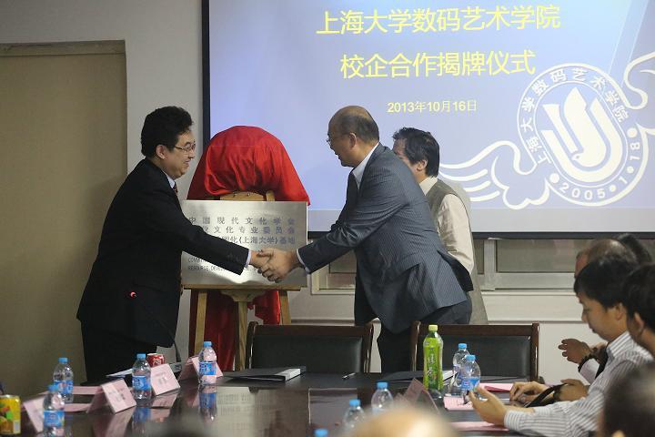 2013年10月16日下午,中国现代文化学会企业文化专业委员会企业人才孵化(上海大学)基地揭牌仪式在数码艺术学院A楼417会议室举行。中国现代文化学会企业文化专业委员会会长郑峰,上海大学党委常委、校长助理、组织部部长、数码艺术学院理事长徐旭,上海大学招生与毕业生就业工作办公室副主任汪宏斌,数码艺术学院院长仲星明,党委书记陈大明,副院长张华良,副院长何小青以及20多名知名企业代表出席了揭牌仪式。此次揭牌是在校领导的关怀下,由郑峰会长和仲星明院长深入洽谈、直接促成的一次高层次校企合作活动。