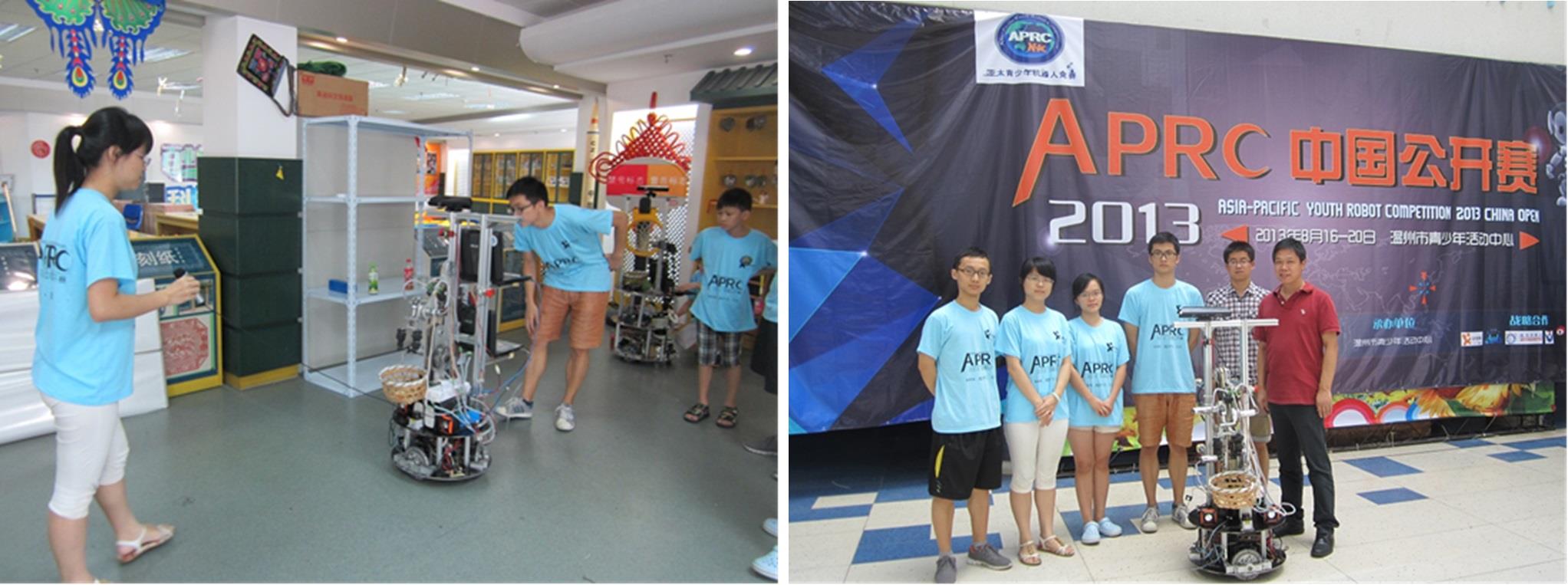 2013年8月18日—21日,上海大学自强队家庭服务机器人组参加了在浙江省温州市举行的 2013APRC亚太机器人竞赛中国公开赛(第4届)家庭服务机器人超市购物项目的比赛,该项比赛集机器人自主运动、跟随与导航、机器视觉、物体识别、机械手臂的运动、语音识别、人机对话等多项综合任务,可谓目前家庭服务机器人比赛的焦点之一。