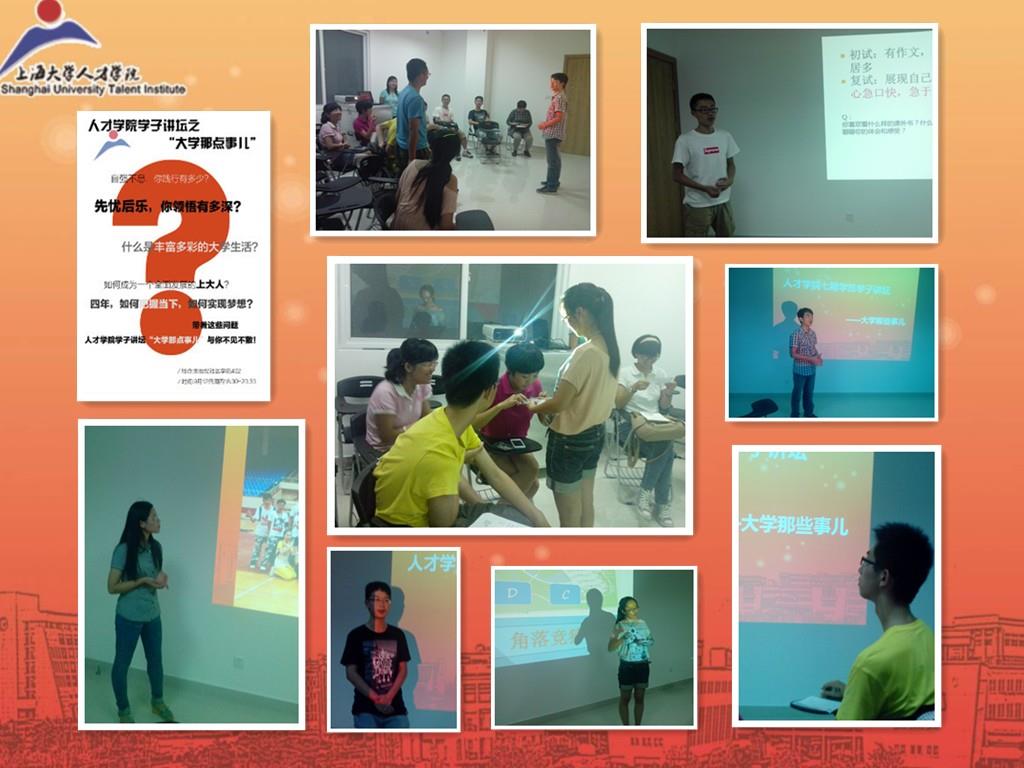 从初识上大到了解上大,从了解上大到热爱上大,每一个上大学子都在以自己的行动书写着独特的大学印记。如何使2013级大一新生更快地适应大学生活、学会面对大学的各种选择...围绕这些问题,人才学院系列学子讲坛之“大学那些事儿”于9月12日18:30在新世纪社区学院402举行,参与分享的不仅有人才学院七期学员还有钱伟长学院的学生。学长学姐在与大一新生真诚的互动与交流中讲述大学故事,分享大学经历,共话大学意义。