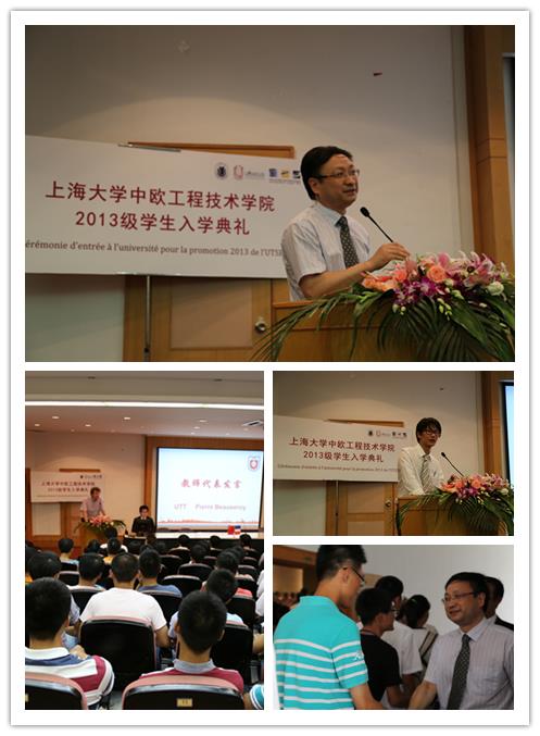 典礼开始前,学院领导及教师代表与每一位中欧新生行握手礼,欢迎他们加入到上海大学中欧工程技术学院这个大家庭。一段回顾2013级新生报到军训的记录视频拉开了典礼的序幕。典礼上,首先由中欧学院法方院长曾孟人致欢迎词,他表示在上大中欧这个新的环境中,充满机会与挑战,希望新生们能够充分利用宝贵的大学时光,珍惜这难得的机会。法国特鲁瓦技术大学教师、中欧学院教师Pierre Beauserouy作为教师代表发言,他表达了对新生加入中欧的祝贺,并给出了未来大学生活学习的建议;他表示,中欧学院为大家提供了一个更大、更广的平台,是机遇,也是巨大的挑战,希望学生们能充分体验这种紧张而又充实的大学生活。