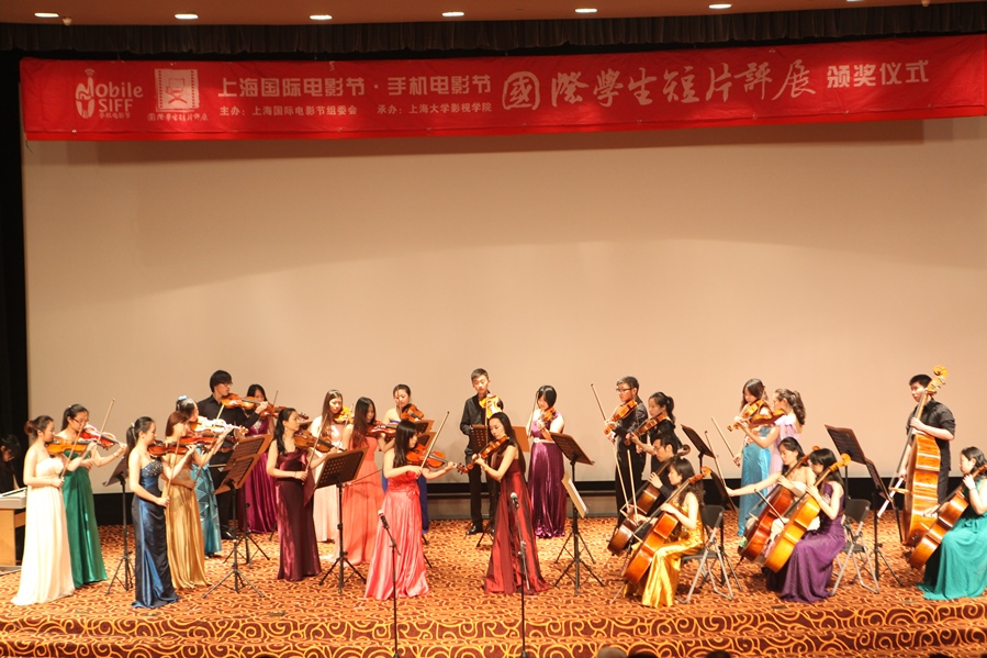 在上海大学音乐学院艺术总监、著名旅美小提琴家夏小曹女士领衔下,上海大学交响乐队的同学们演奏了精彩的开场节目“经典电影音乐”,拉开了整场颁奖仪式的序幕。在表现青年导演成长历程的学生手绘沙画创意节目之后,上海国际电影节业务总监於侃、夏威夷国际电影节主席Chuck Boller、上海大学副书记忻平、上海大学影视学院书记刘日宇、影视学院副院长郑涵等嘉宾以及五位评委一一上台揭晓奖项。