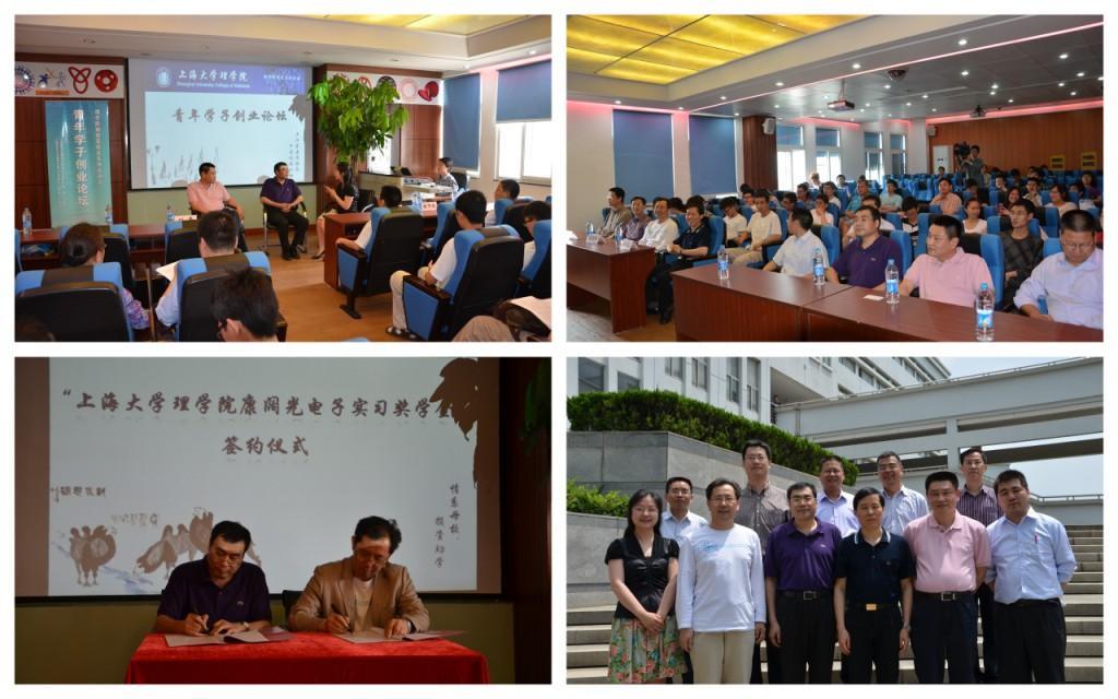 5月22日上午,上海大学理学院校友会活动之理学院青年学子创业论坛暨理学院康阔光电子实习奖学金签约仪式在G507隆重举行。理学院党委书记兼执行院长翁培奋、党委副书记黄颂翔、刘亮,副院长盛万成、物理系主任赵新洛、总支书记张义邴等院系领导,理学院物理系87届校友上海康阔光通信技术有限公司董事长黄勇、理学院物理系87届校友上海精密合金有限公司董事长虞维扬,以及理学院教师、研究生、本科生代表出席了活动。