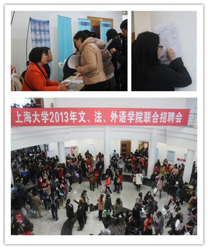 2013年3月24日下午13时,上海大学2013年文、法、外语学院联合招聘会在宝山校区J楼大厅拉开帷幕,大批怀抱求职梦想的应届毕业生前来应聘求职。校招生与毕业生就业工作办公室孙玉华、胥俊,法学院党委书记胡建国、法学院党委副书记傅新华、外语学院党委副书记王国建和文学院党委副书记王丽娜等到现场指导。